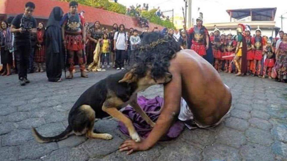 Perro consuela a Jesús en vía crucis y se vuelve viral en redes sociales durante Semana Santa