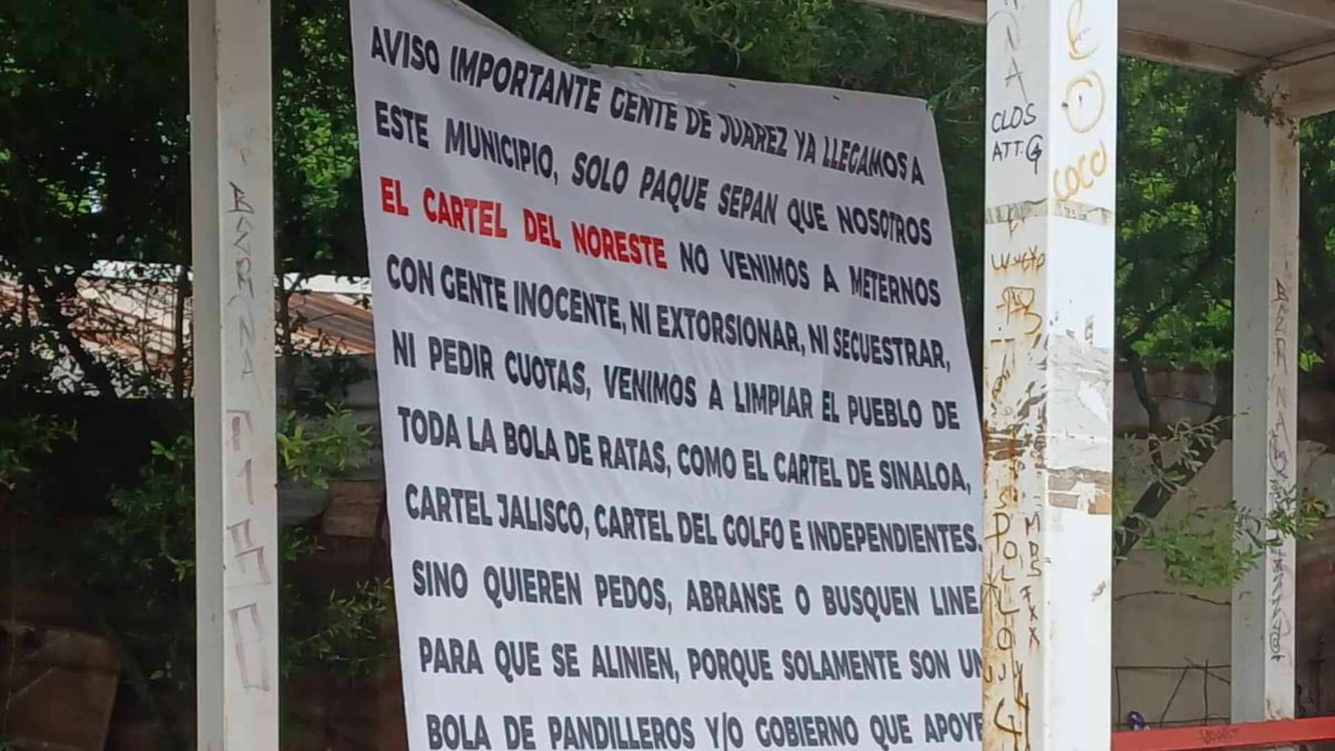 Este martes, el Cártel del Noreste (CDN) hizo sentir su presencia en al menos tres municipios de Nuevo León al colocar mantas firmadas por su grupo armado conocido como Los Chukys. Las lonas fueron halladas en Juárez, Guadalupe y Santa Catarina, y contienen un mensaje claro de advertencia dirigido a grupos rivales y a las autoridades locales.